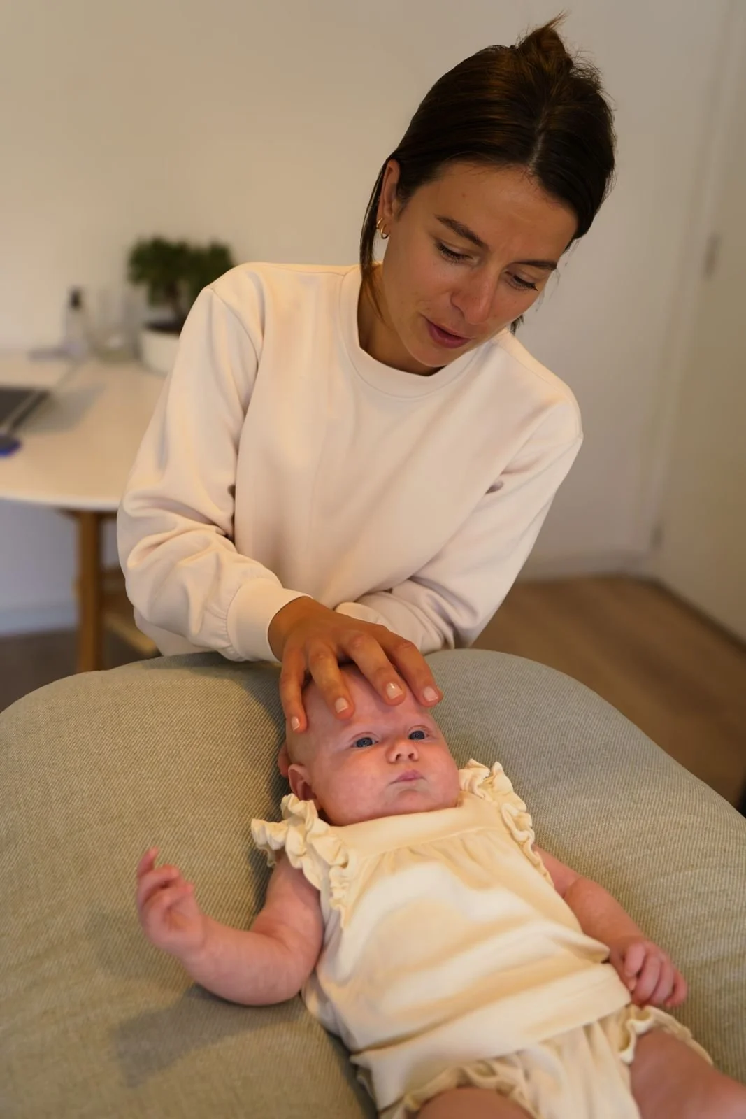 Ook baby’s behandel ik met manuele technieken, maar dan met gepaste voorzichtigheid. Het weefsel van een pasgeboren baby is nog zo zacht, dat stevige technieken niet nodig zijn.